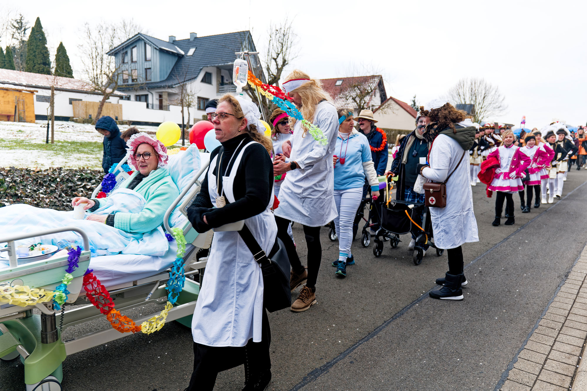Am Viadukt im Ortskern, direkt unter der bekannten Brücke, wurden alle teilnehmenden Vereine und Gruppen vorgestellt. Das Kompetenzzentrum bedankte sich mit einer musikalischen Darbietung, die die Stimmung nochmal richtig anheizte: „Geriatrie, unser Krankenhaus ist groß wie, komm zu uns und fühl die Energie, wir sind die Geriatrie.“ Danach zog das Krankenhaus-Team mit seinem Krankenhausbett, das ein echtes Highlight des Umzugs war, weiter